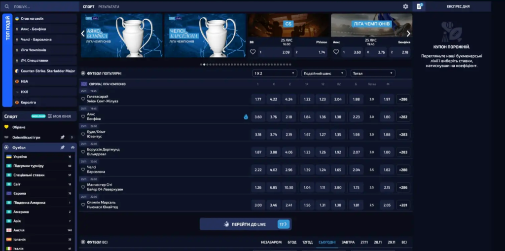 Букмекерский раздел All win UA охватывает 30+ видов спорта и 15+ киберспортивных дисциплин с прематч и live-ставками. Спортивная линия включает футбол (200+ лиг включая АПЛ, Ла Лигу, Серию А, Лигу Чемпионов), баскетбол (НБА, Евролига, национальные чемпионаты), теннис (ATP, WTA, турниры Большого Шлема), хоккей (НХЛ, КХЛ), волейбол, бокс, MMA, Formula 1. Киберспорт представлен CS2, Dota 2, League of Legends, Valorant, FIFA, NBA 2K с охватом турниров ESL, DreamHack, PGL, IEM. Коэффициенты конкурентные с маржей 5-7% на топовые матчи. Маркеты: исход, тотал, фора, точный счет, статистика игроков, комбо-ставки. Минимальная ставка 10 грн, максимальная зависит от события до 100000 грн. Live-трансляции доступны для избранных матчей футбола и киберспорта. Кэшаут функция позволяет закрыть ставку досрочно до окончания события.